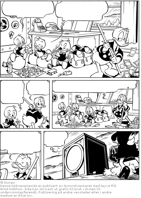 … og slik ser altså ei side frå eit Donald-manus ut. Alle replikkar er skrivne inn i fulltekst, og sjølv om eg normalt ikkje forklarer i detalj korleis alle møblar og landskap skal sjå ut, må eg påpeika det dersom det er viktig for historia. I dette tilfellet blei historia teikna av Arild Midthun. Dersom du skal teikna dine eigne manus, treng du sjølvsagt ikkje vera såpass detaljert som eg er her.